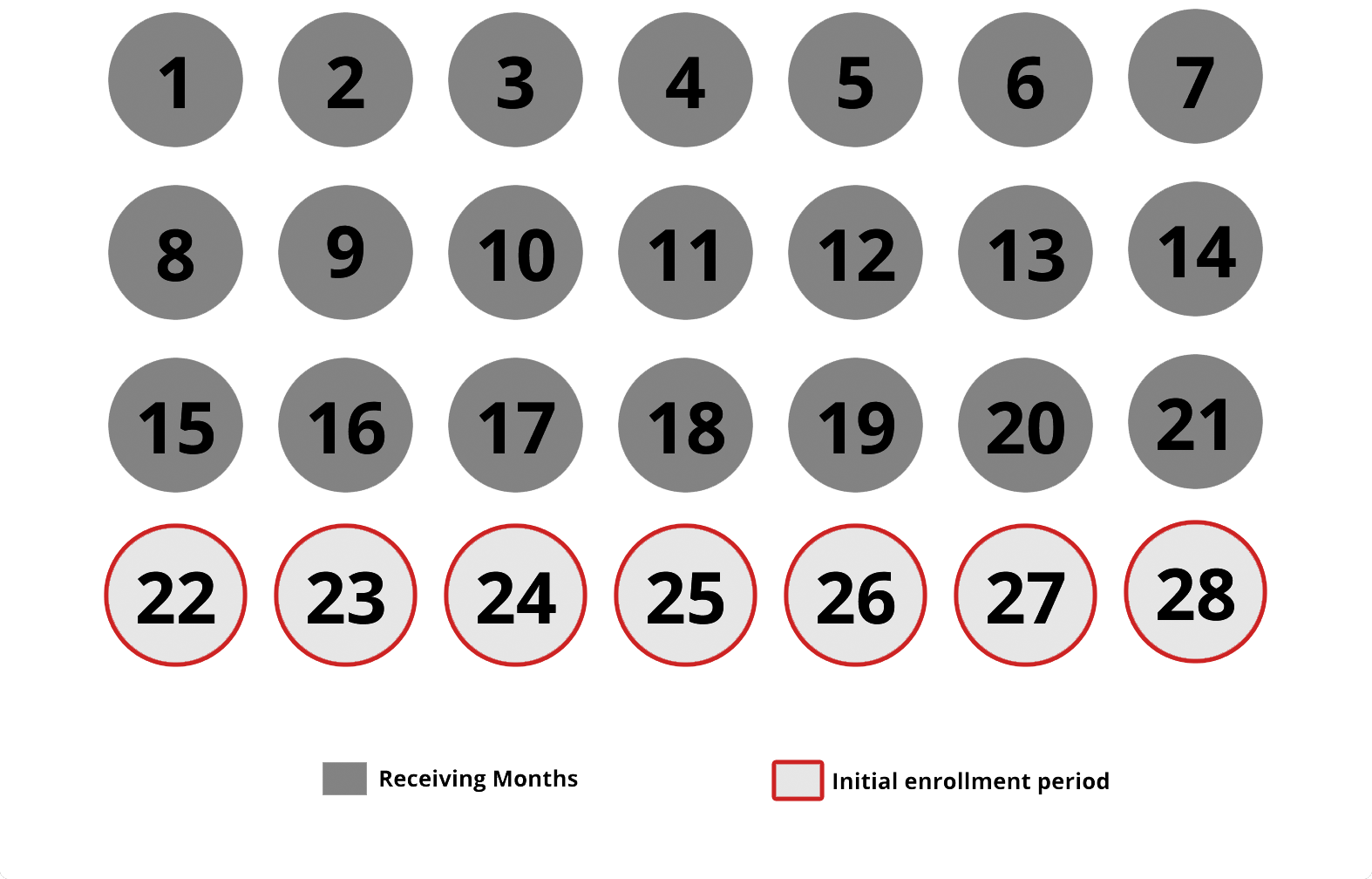 Example: If you began receiving disability benefits in January 2022, your Initial Enrollment Period is from November 1, 2023 until May 31, 2023.